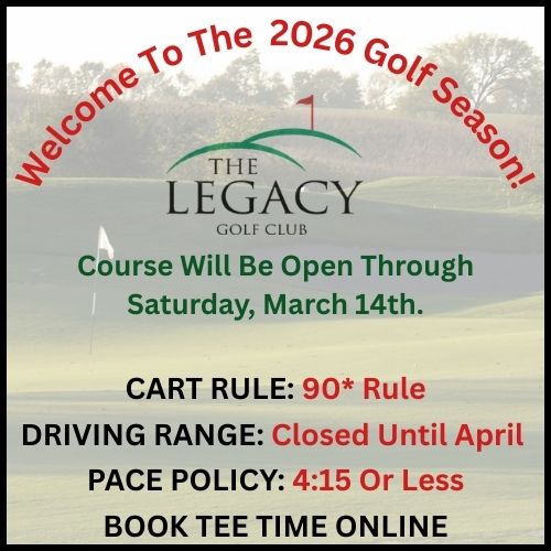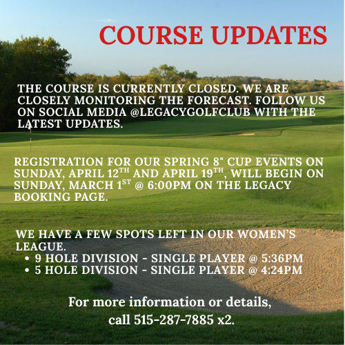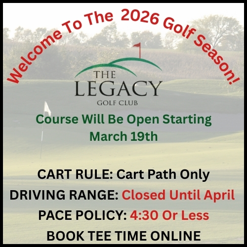 Discover championship‑quality golf at The Legacy Golf Club — an 18‑hole public course south of Des Moines built for players of all skill levels. With three tee sets, wide forgiving fairways, manicured bentgrass greens, and a full practice facility, it’s ideal whether you’re looking for a fun round or a serious challenge. Enjoy water‑lined holes, risk‑reward tees, and a friendly clubhouse atmosphere including dining and event‑ready banquet space.